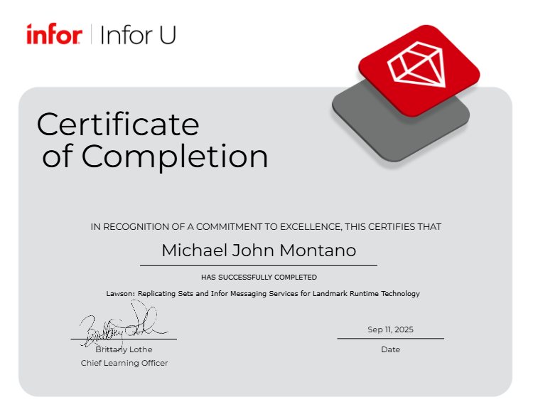 Lawson: RepSets and IMS for Landmark Runtime Technology | ![]() | Infor U Campus | N/A | September 11, 2025 | 1 hour 58 seconds | View Digital Certificate |