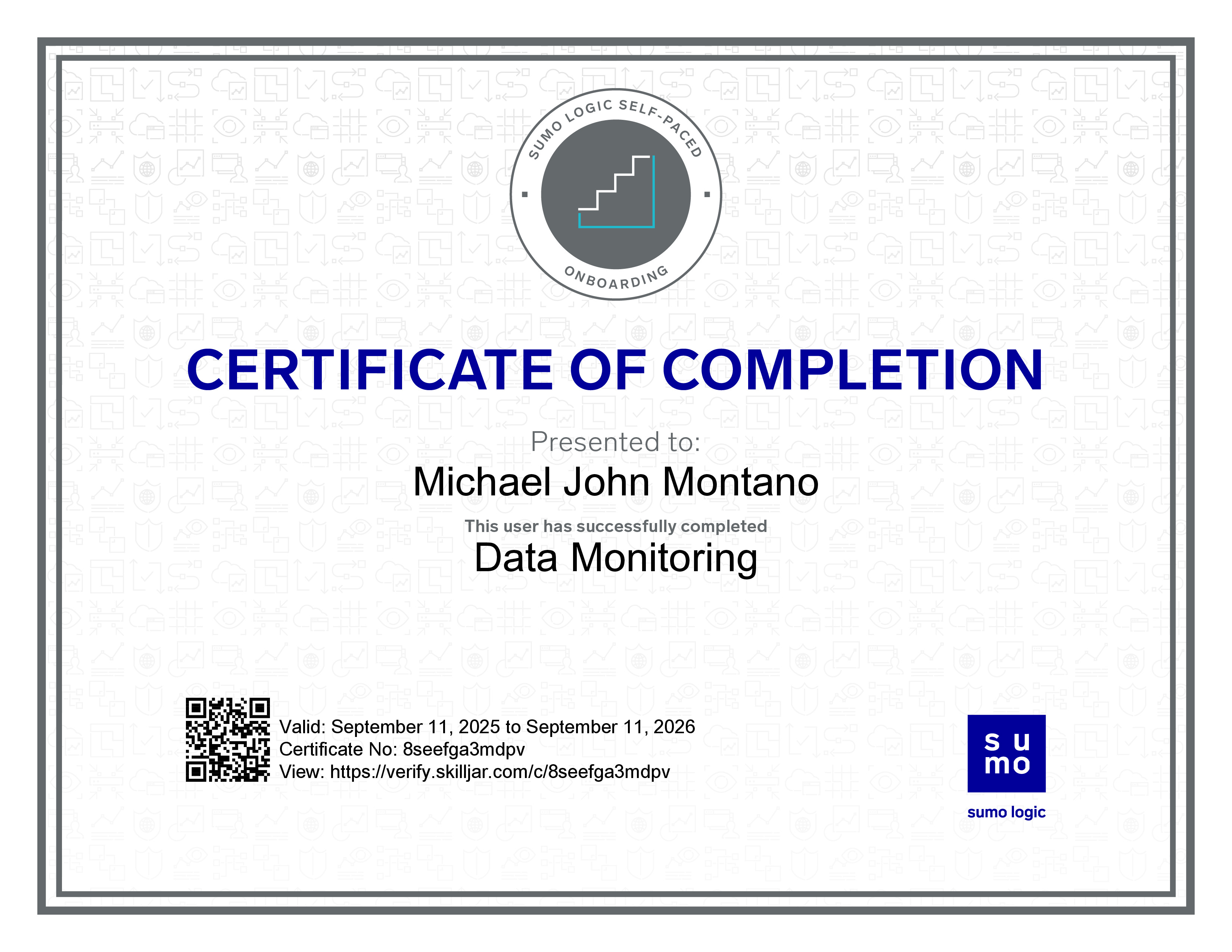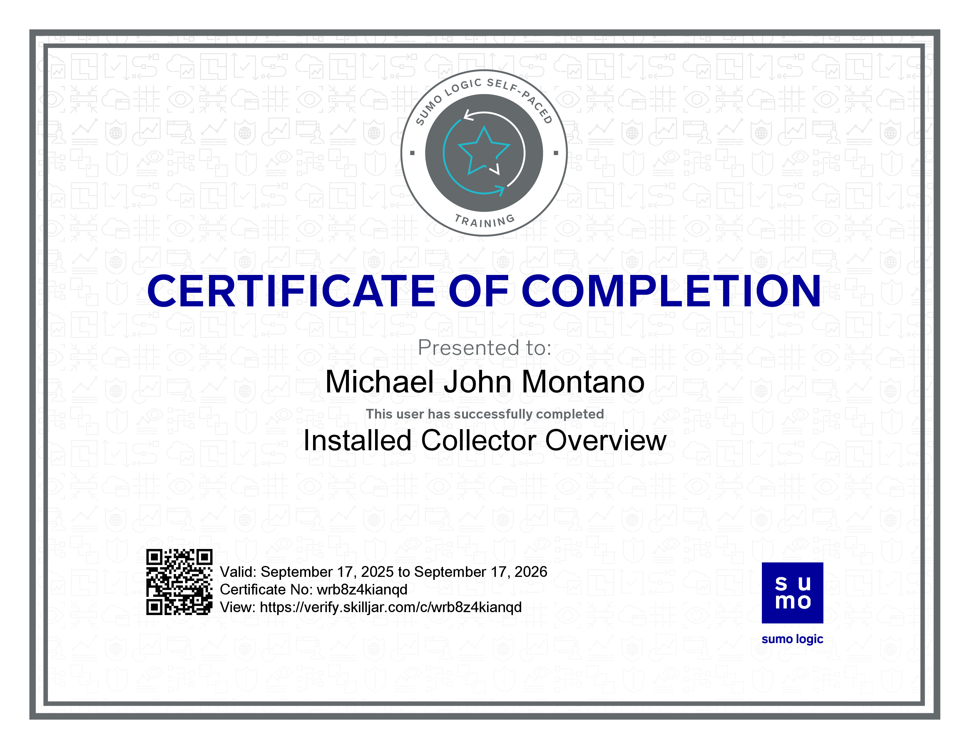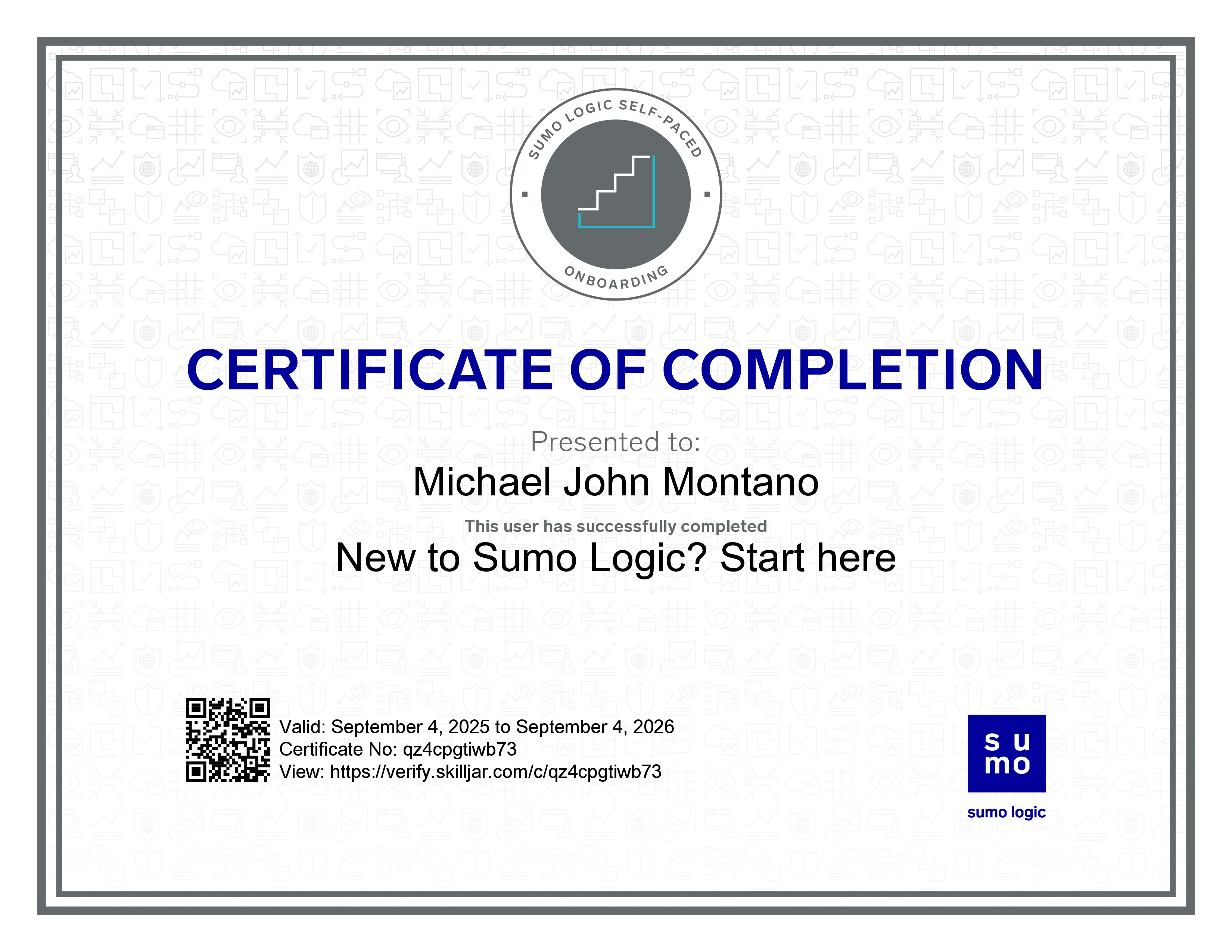 Data Collection | ![]() | Sumo Logic | fj8c23rribqc | September 7, 2025 | 35 minutes | View Digital Certificate |