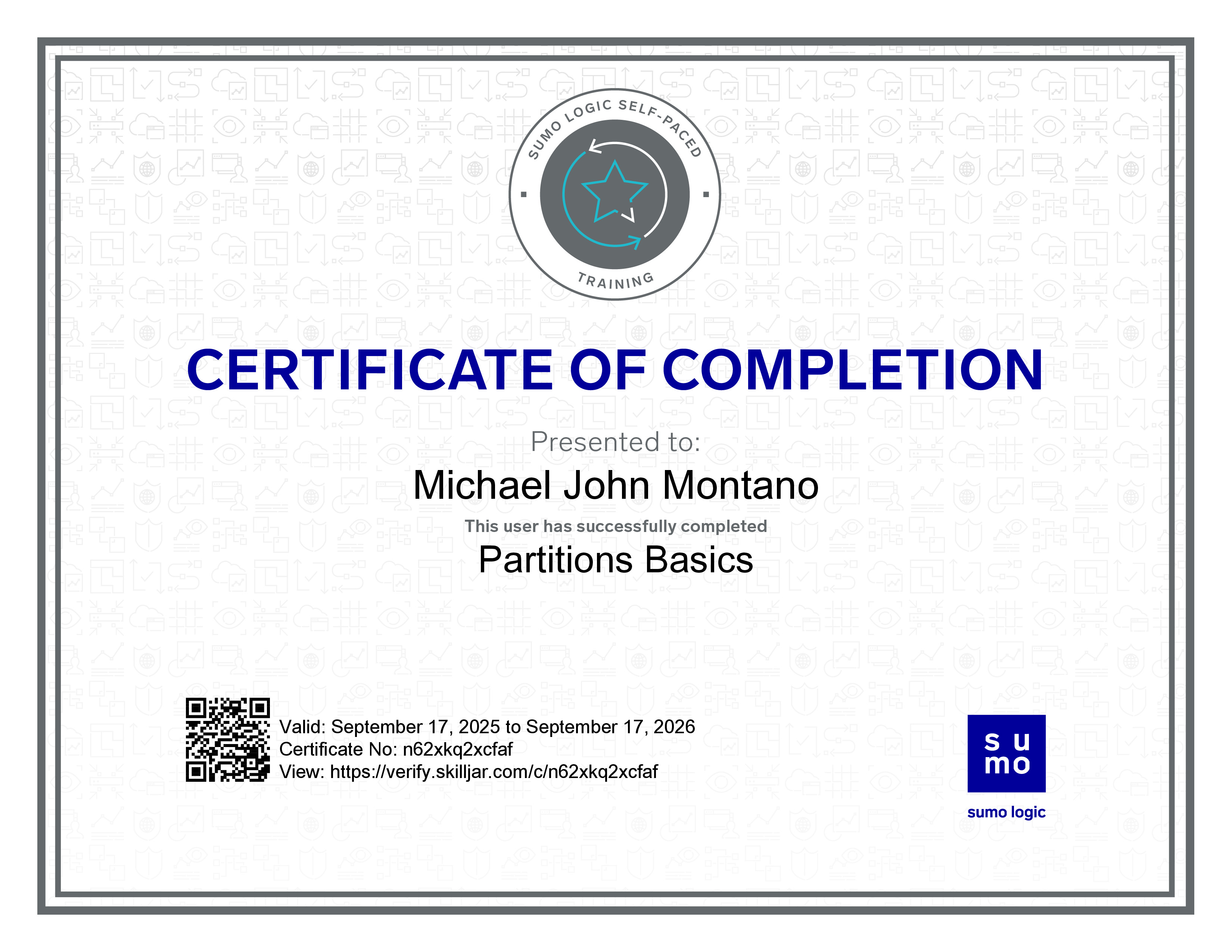 Partitions Basics | ![]() | Sumo Logic | n62xkq2xcfaf | September 17, 2025 | 3 minutes | View Digital Certificate |
